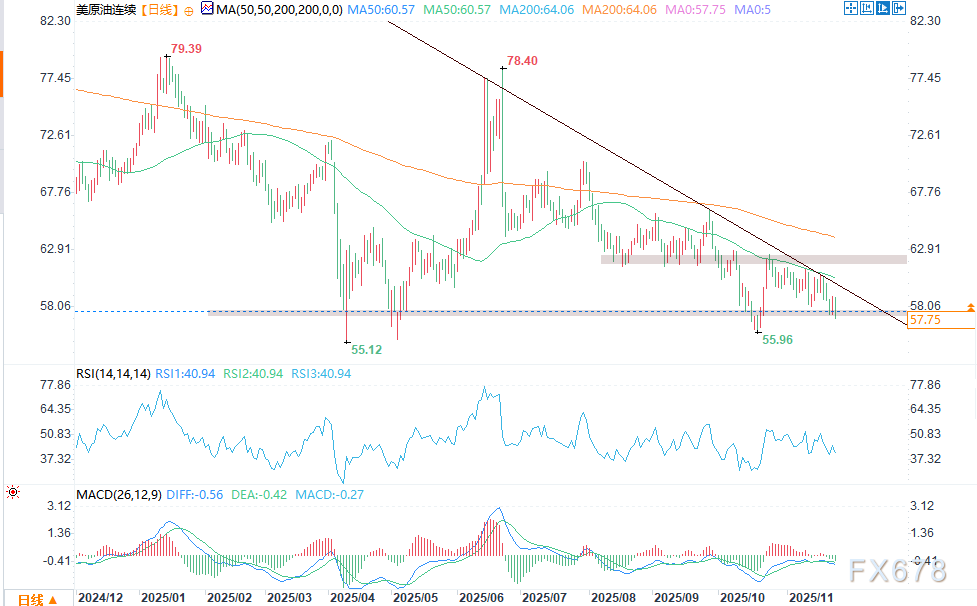 这一消息对原油市场产生直接冲击。俄罗斯作为全球顶级石油生产国,近年来受美欧英多轮制裁限制,全球市场销售能力严重受限,而乌克兰对俄炼油厂的无人机袭击进一步阻碍了其石油生产。一旦和平协议正式签署,俄罗斯石油有望逐步重返全球市场,这将对本就供需失衡的原油市场形成显著冲击。国际能源署(IEA)早已预警,2026年全球原油市场将出现创纪录的供应盈余,供应量预计比需求多出约330万桶/日,俄罗斯石油的回归将进一步放大这一过剩格局。受此影响,11月25日WTI原油短线直线跳水,盘中跌幅一度超2.57%,布伦特原油同步下跌2.47%,WTI原油盘中报57.99美元/桶,已无限接近关键支撑区间。