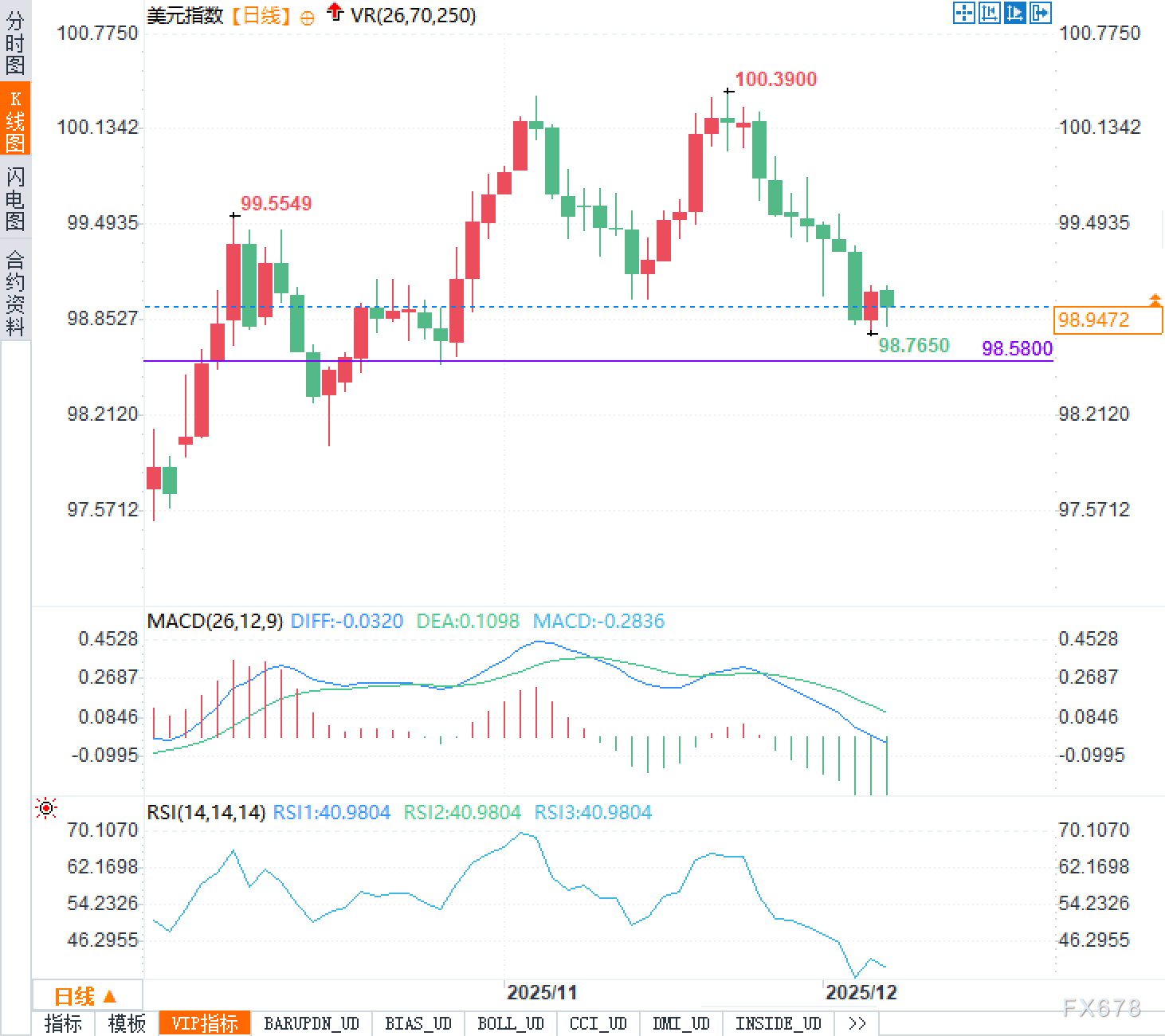 从日线结构看,美元指数近期两次冲高,先后形成约99.55与100.39的阶段高点,之后回落并进入高位回撤节奏。当前价98.9472位于前期震荡密集区附近,短线呈现“跌后整理”的形态。图中98.58一带为较明确的水平支撑,98.76附近的低点带来一定技术反应;而99.49-100.13区域对应前期上沿与密集K线区,仍是上方重要压制。