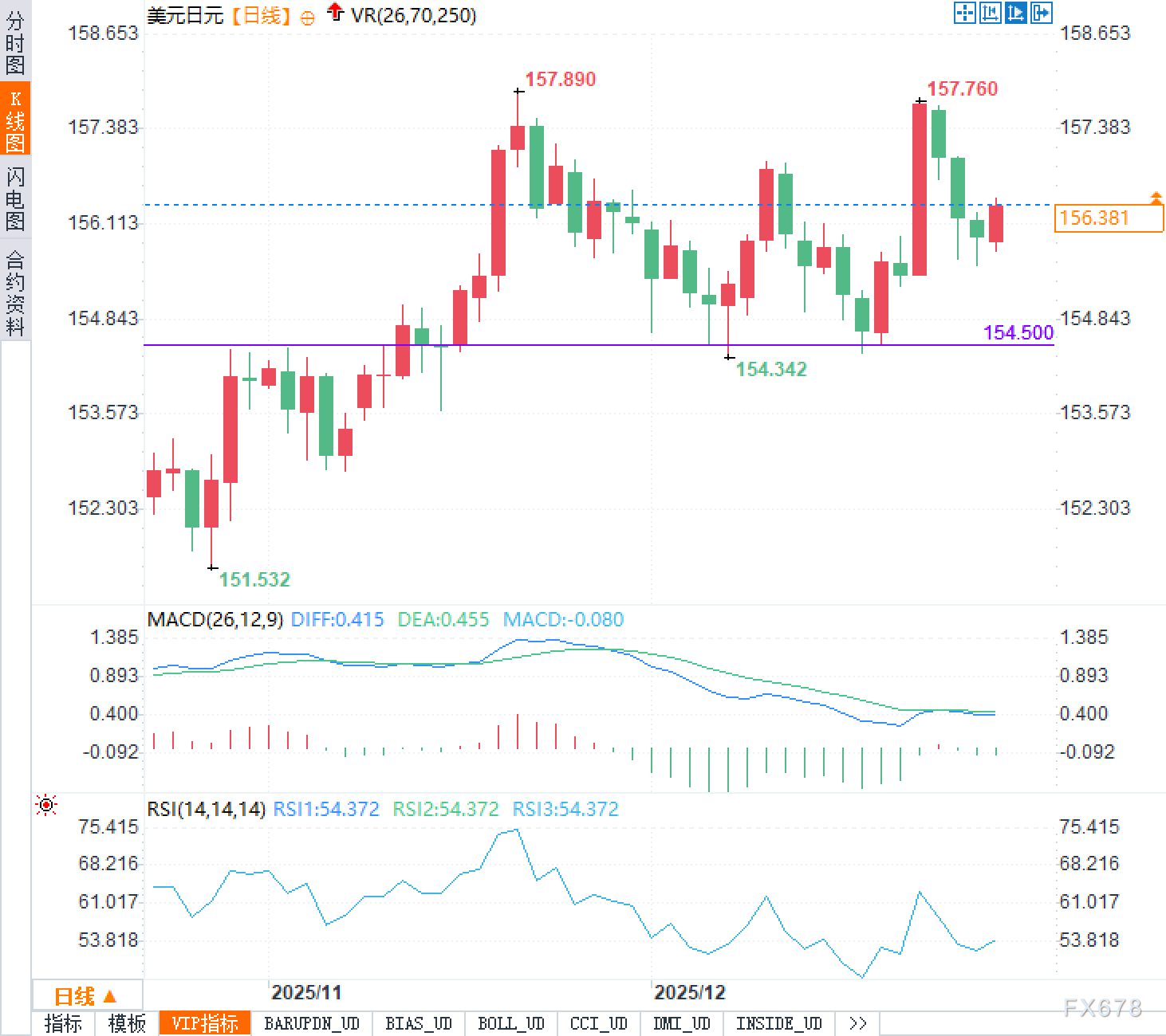 美元兑日元当前更像是在高位整理而非单边行情。价格自年内低位抬升后,多次在157上方受阻,短期高点附近出现明显的冲高回落。与此同时,下方155附近多次获得承接,说明回落时仍有资金愿意在相对优势的利差格局下维持美元敞口。技术层面,图形上可观察到158附近的阻力意义较强,155附近则构成近端支撑带;更下方154.50一线与中期均线区域重合,属于“支撑共振”的位置。若市场风险偏好波动加大,价格往往会围绕这些关键区间来回拉扯,从而呈现“噪音很大但方向不易走出”的典型年末特征。